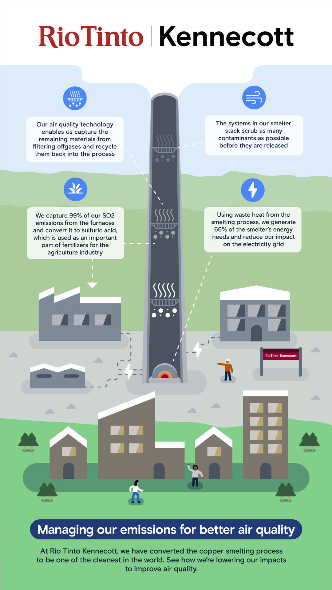 Seeing Kennecott’s scale was surreal: trucks the size of suburban homes, filtration systems fine-tuned to tap-water purity, and teams turning mountain runoff into copper anodes. Our job was to translate that operational reality into stories the community could absorb quickly and trust. We paired simplified science with accessible design to build a narrative system that made progress legible—connecting technical work to local outcomes, and turning “sustainability” from an abstract claim into a set of concrete, understandable actions.